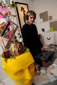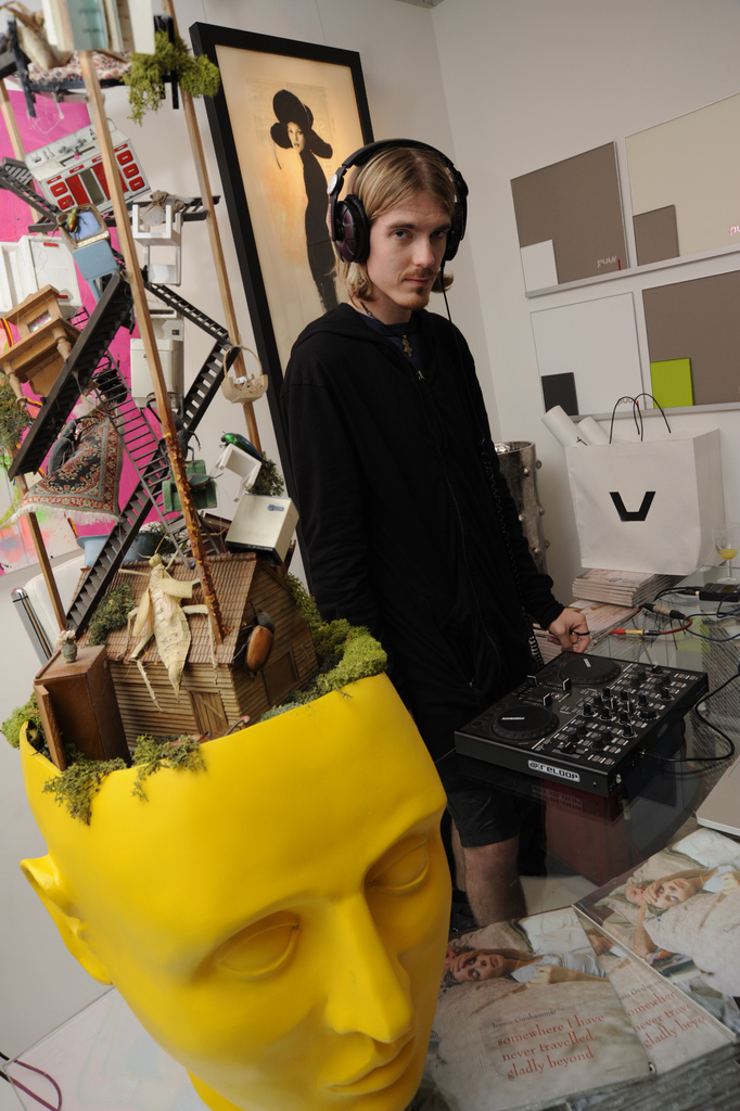 While working for Debut Contemporary gallery in Notting Hill. I helped to organise a blowout private view featuring works of the new artists. As it was September, and we all know september is the fashion month, I decided on a ‘wearable art’ theme. With this, I asked a friend a favour – DJ Erol Sabadosh to play some tunes for the night as he did with the previous month’s private view pictured here: