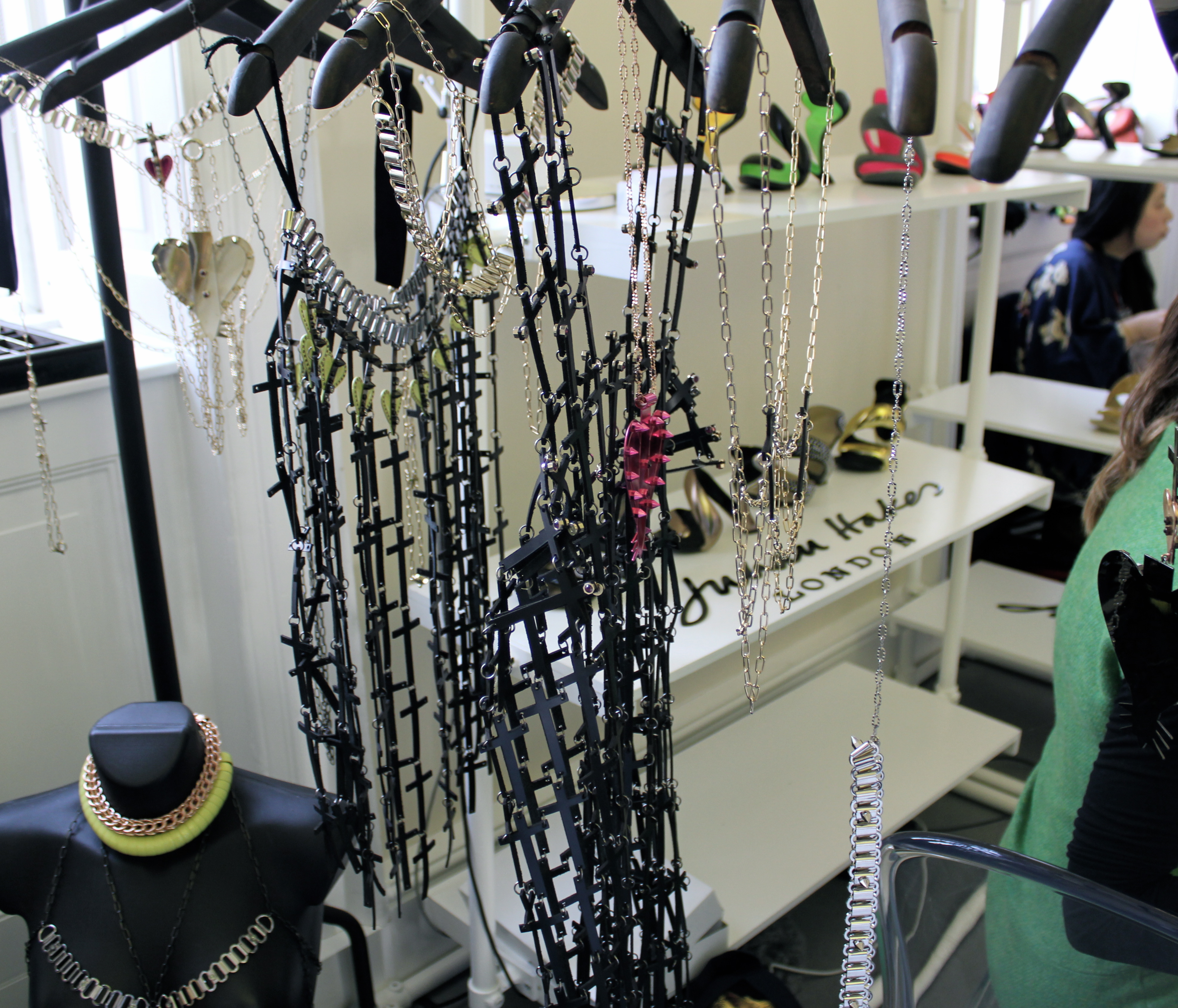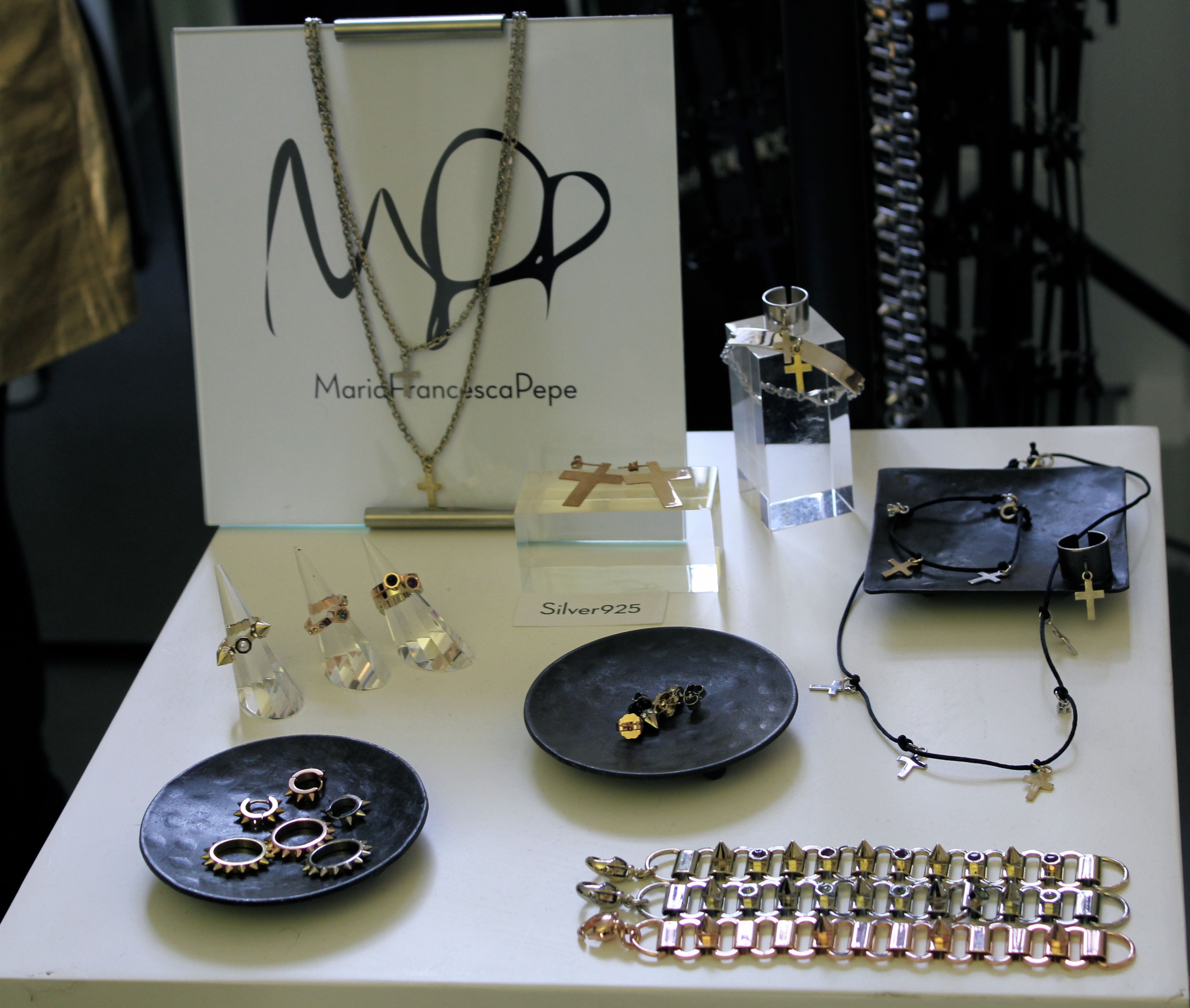 Quoting lyrics from the infamous Beatles song ‘Can’t buy me love’ MFP creates more than just jewellery, featuring body armour with varnished heart shaped pendants, pearls and amethysts mounted on ornate chains decorating the torso. In contrast with matt-lime varnished pointed crosses encrusted with grey diamond crystals, studs and black pearls for the tougher woman. These eye catching body pieces are pure fun, MFP has also created a studded chain swimsuit and underwear!