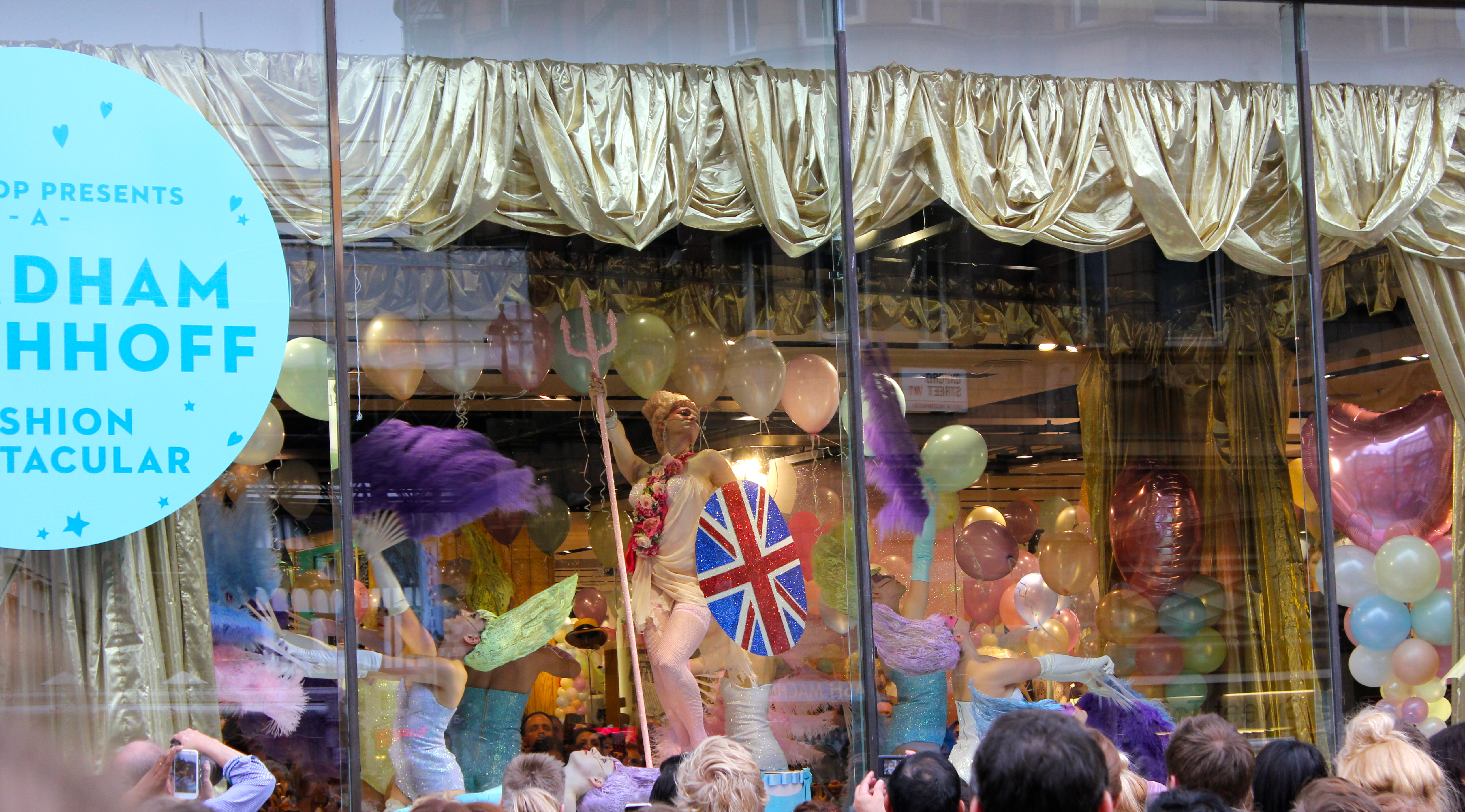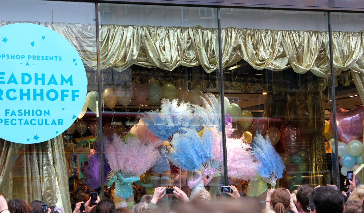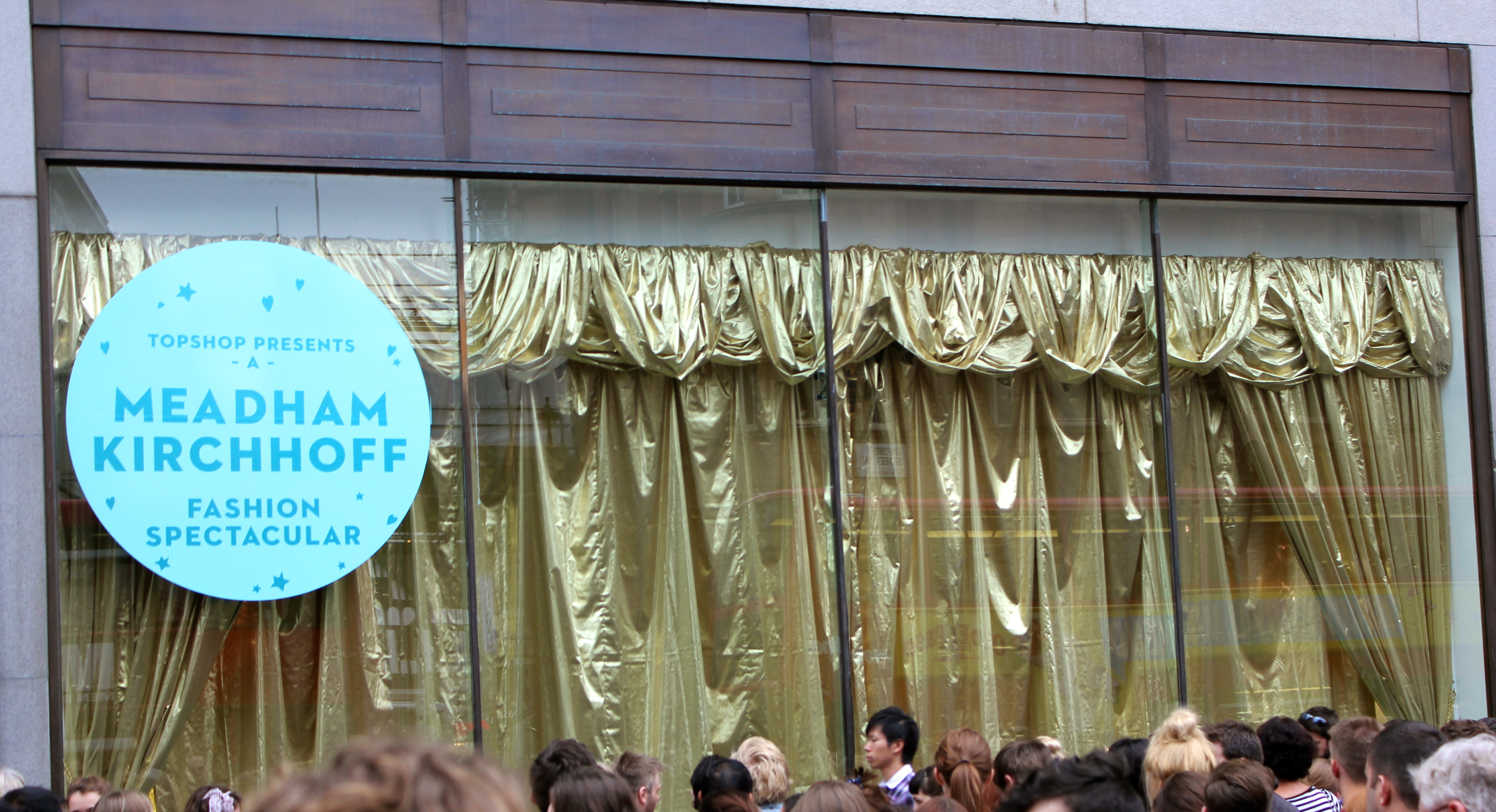 anywho, as the crowd were building up outside Topshop, we were all excited to see what was behind the gold lamé curtain, they revealed it to be…