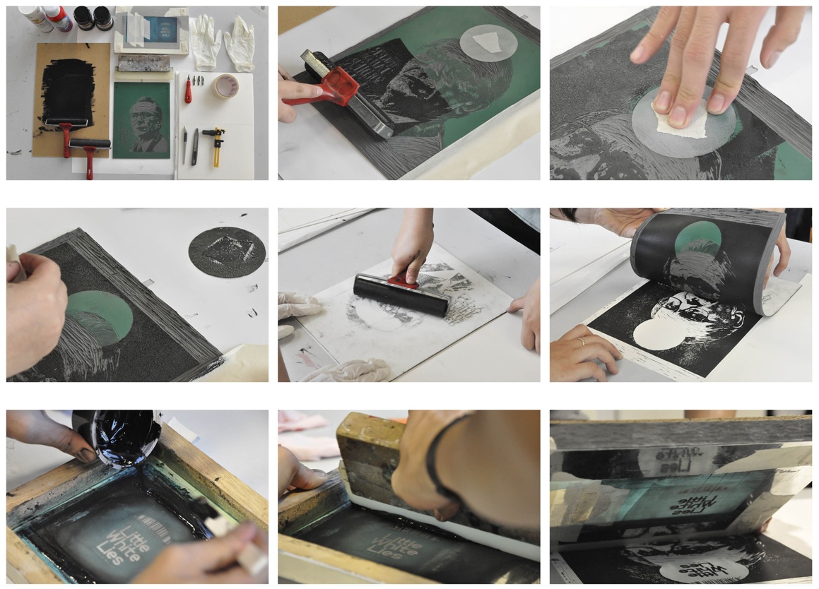 Surprisingly the only linocut design of the exhibition and so very well defined it had to be made by five students – Chaeun Park, Donna Fitri, Lamsyah, Law Yuanhong Ivan, Muhammad Izzat Bin Rahmat and Tan Yun Ru from the Lasalle College of the Arts, Singapore even included the ‘making of’ shots –