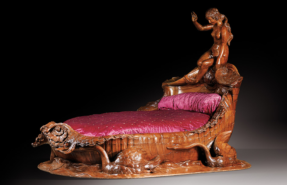 An exceptional carved mahogany bed, second half 19th-century. Estimate £500,000–800,000. The precise history of this unique commission remains shrouded in history, yet it has traditionally been associated with the legendary Hôtel de la Païva, the Champs-Elysée love nest of Esther Lachmann – the richest and most notorious demi-mondaine of the Second Empire. The matchless bateau-lit found its way into ‘La Fleur Blanche’, the notorious and celebrated brothel at 6 Rue des Moulins. Frequented by international high society, it was most notably where artist Henri de Toulouse-Lautrec set up his easel – in whose biography the bed is described in detail.