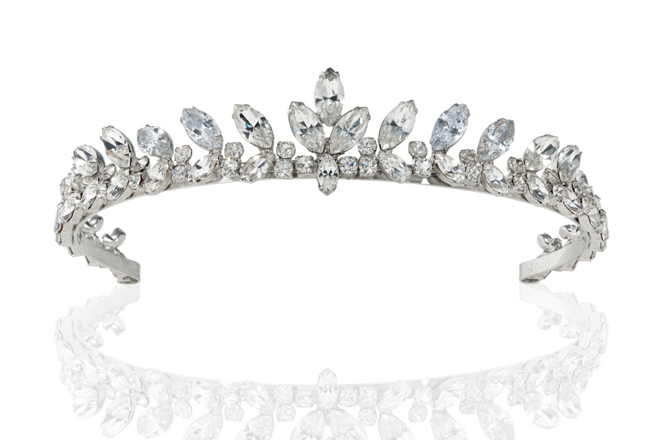 A colourless paste tiara composed of a continuous series of graduated navette and circular shaped paste, to close-back settings on a sprung frame; worn by Audrey Hepburn to the London premiere of The Nun’s Story, July 1959 and as Joanna Wallace in the 1967 20th Century Fox production Two For The Road 11 ¼ in. (29 cm.) inner circumference £7,000 – £10,000